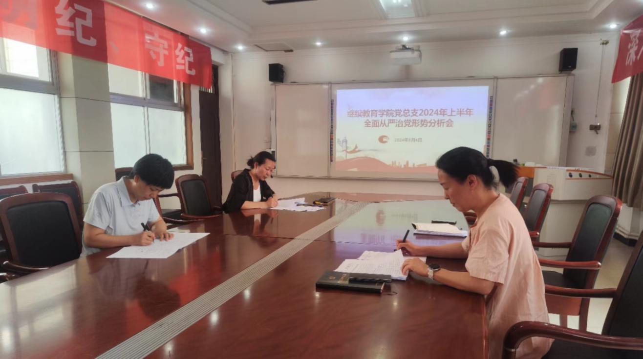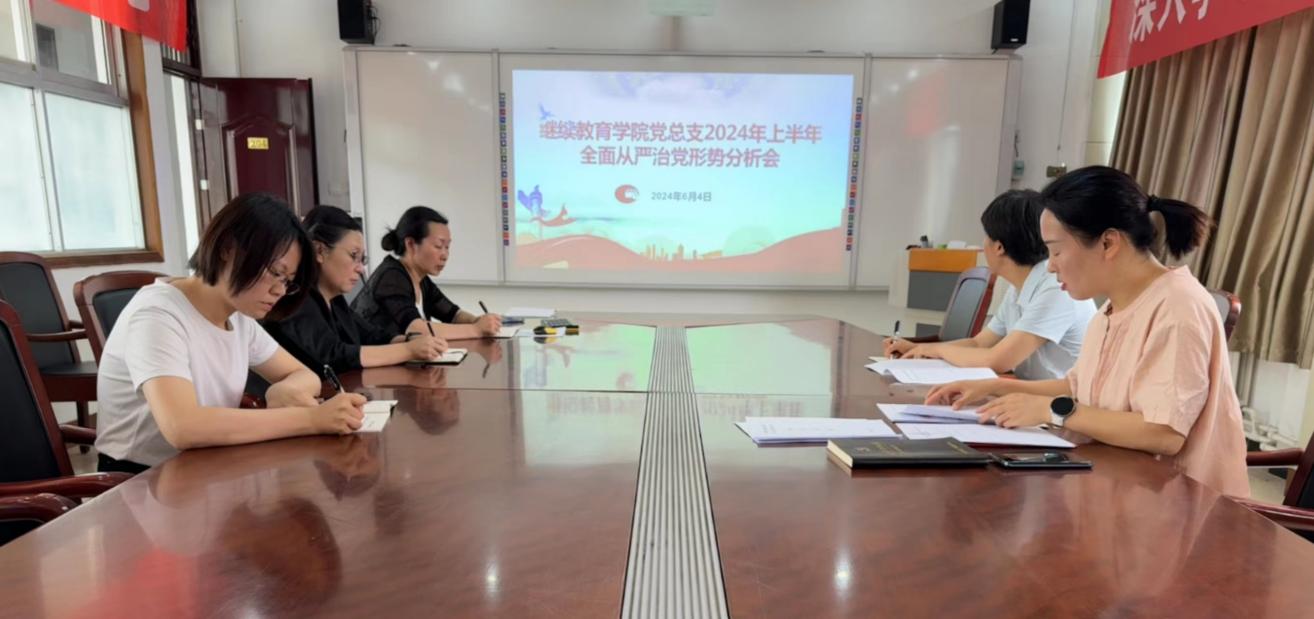 6月4日上午,继续教育公司党总支召开2024年上半年全面从严治党形势分析会,会议由党总支书记杨聪聪主持,全体党员参加。
